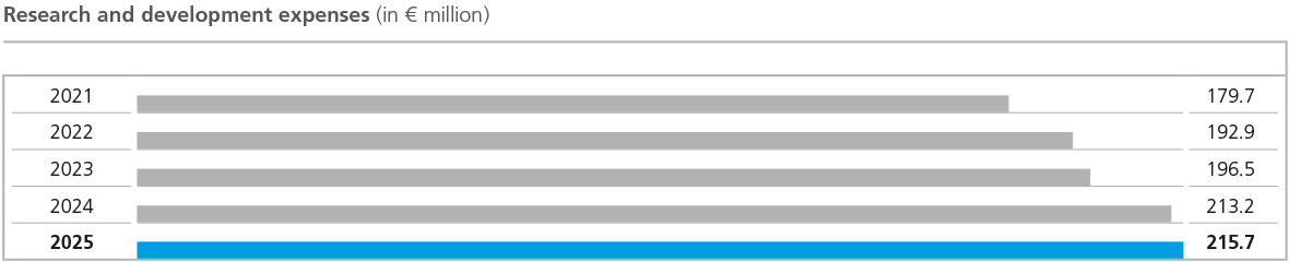 Our innovative strength is based on an open and dynamic corporate culture that gives our 1,281 employees in research and development centers worldwide the freedom for creative and entrepreneurial action. The equipment in our development centers enables our employees to transform ideas into market-ready solutions. Research and development expenses increased by € 2.5 million year on year to € 215.7 million (previous year: € 213.2 million). The share of sales accounted for by research and development expenditure rose to 7.0 % (previous year: 6.7 %), mainly due to the nominal decline in sales compared with the previous year. In general, our R&D expenditure is linked to the achievement of key milestones, the implementation of individual customer requirements in future innovative products, and the long-term orientation of our innovation activities.