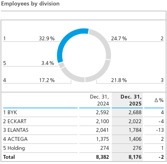In the BYK division, the number of employees increased in 2025 by 96 to 2,688 (previous year: 2,592), mainly in marketing and sales and in production.