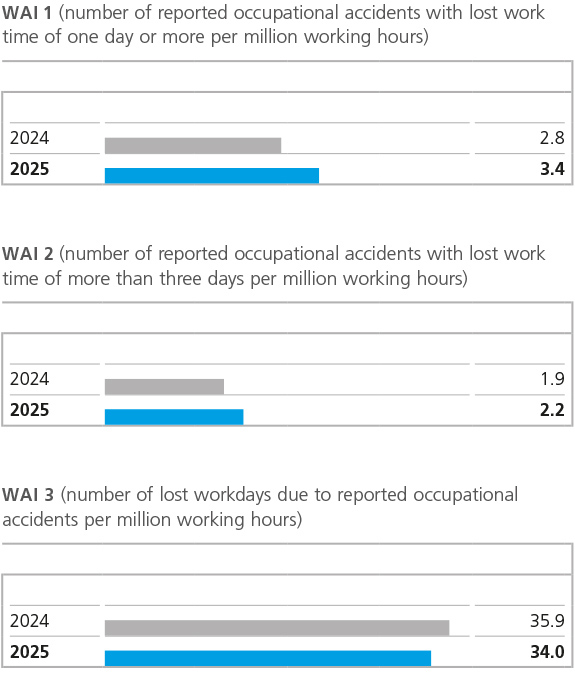 Throughout the Group, the Work Accident Indicator (WAI) serves as the key performance indicator for recording and evaluating the development of occupational safety at all sites based on reported accidents with lost work time. Three key figures are defined for better comparability: WAI 1 refers to the number of reported occupational accidents with lost work time of one day or more per million working hours. WAI 2 comprises the number of reported occupational accidents with lost work time of more than three days per million working hours. WAI 3 represents the number of lost workdays due to reported occupational accidents per million working hours, whereby a maximum of 30 days per accident is taken into account.